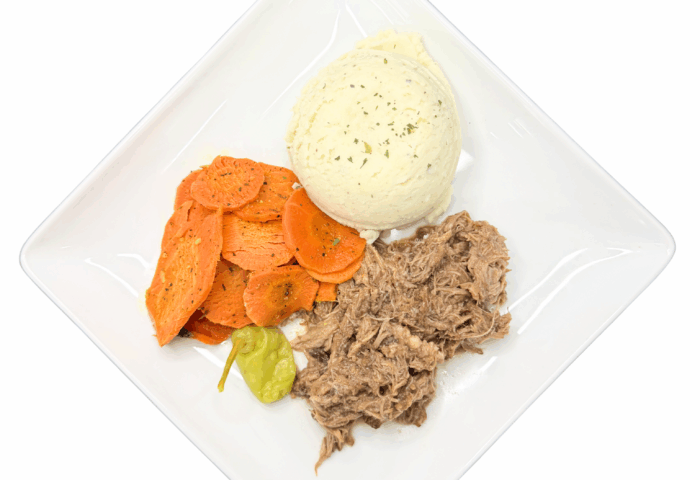 Mississippi Pot Roast — tender, slow-cooked turkey infused with zesty pepperoncini and savory ranch seasoning, creating a bold, tangy, and melt-in-your-mouth comfort classic accompanied with side of mashed potatoes and coined carrots.Gluten-Free