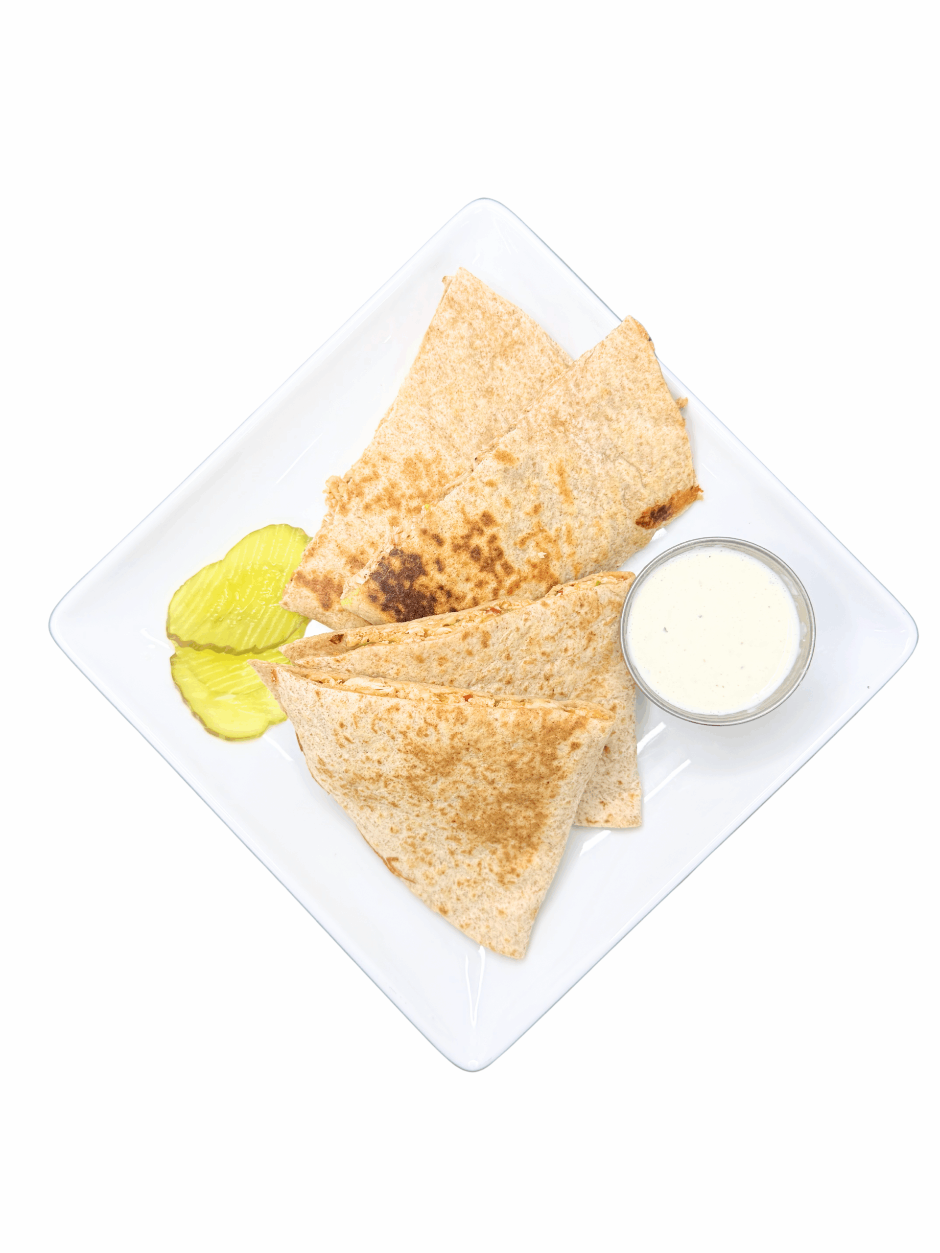 Grilled tortilla stuffed with seasoned chicken, melted cheese, and BBQ sauce, served with a side of buttermilk ranch and pickles.