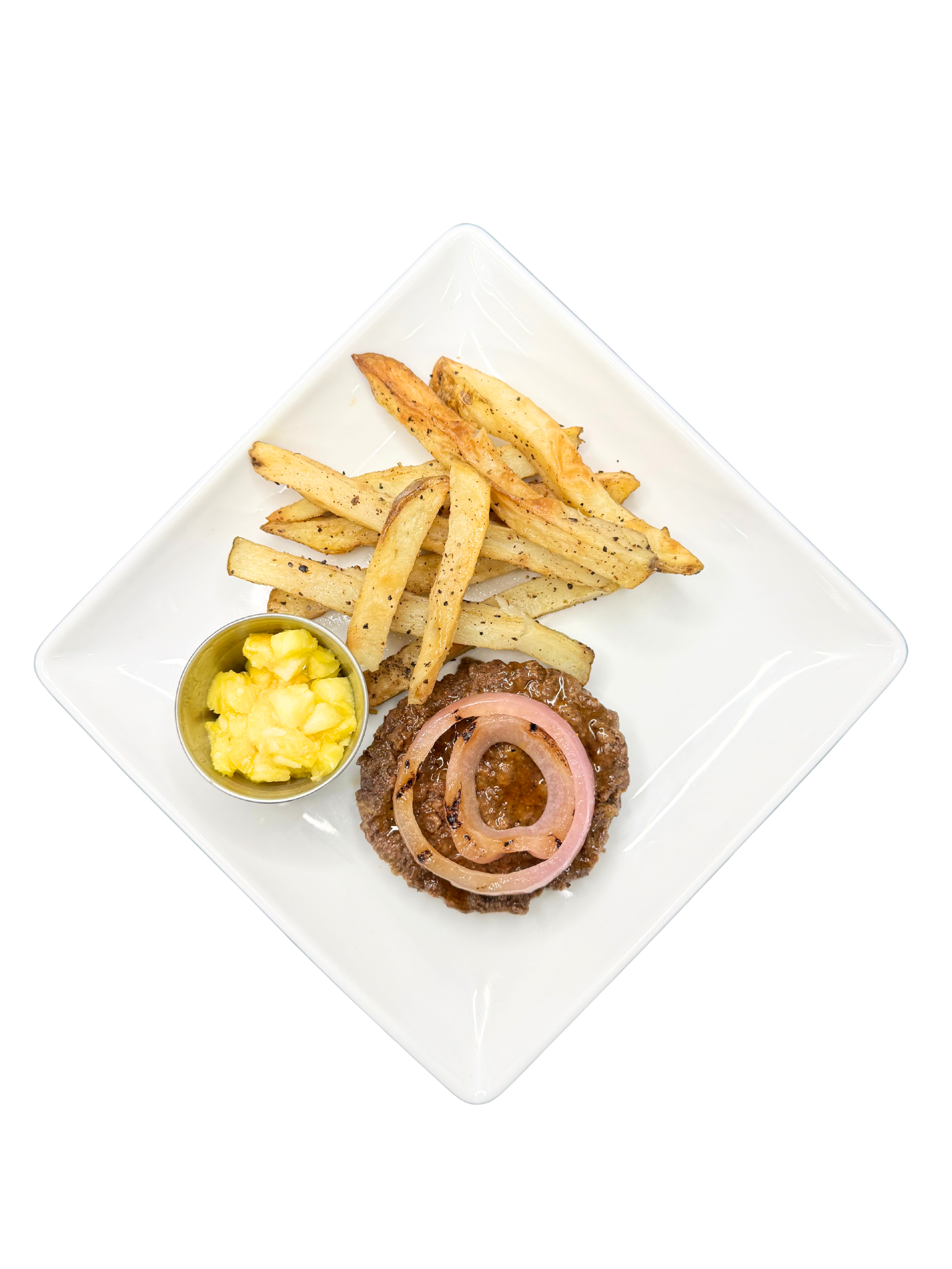 A juicy beef burger topped with Teriyaki sauce, and red onion, with a side of white potato fries and diced pineapples.