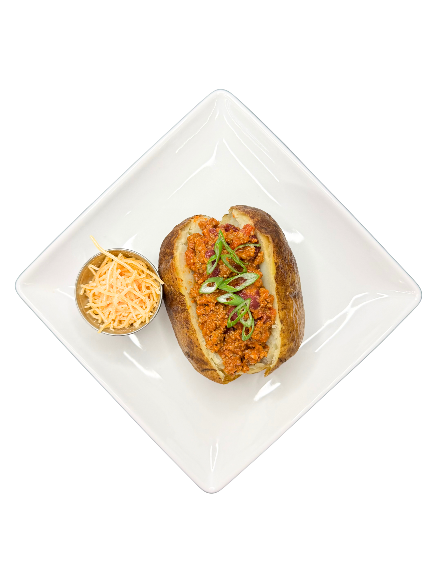 INGREDIENTS: WHITE POTATO, CHILI, GROUND BEEF, GREEN ONION. SIDE OF: CHEDDAR CHEESE