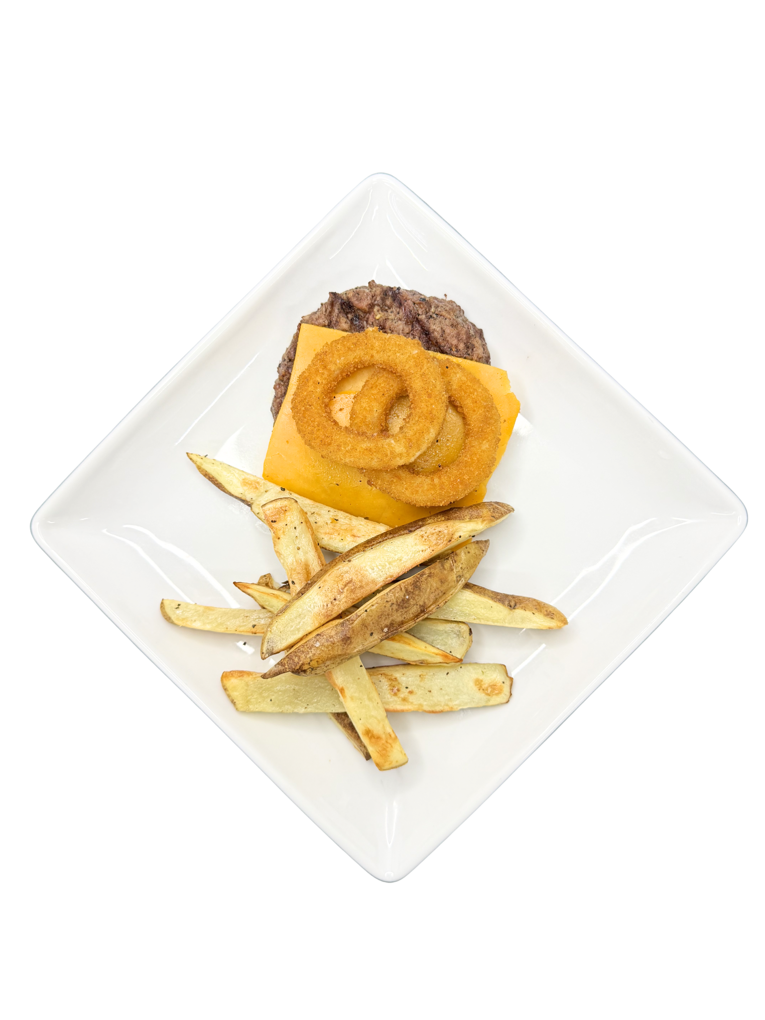 INGREDIENTS: GROUND BEEF, POTATO, ONION RING, BREADCRUMBS, CHEDDAR CHEESE, BBQ SAUCE, OLIVE OIL, SEASONINGS
