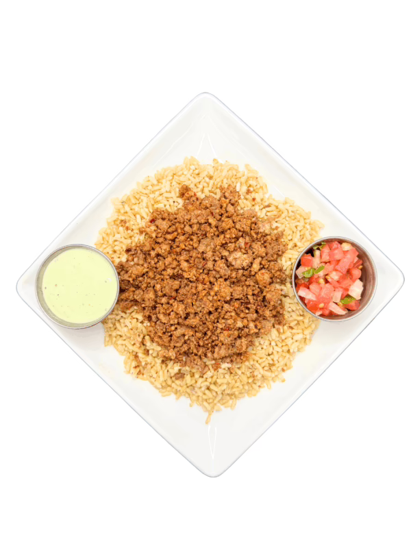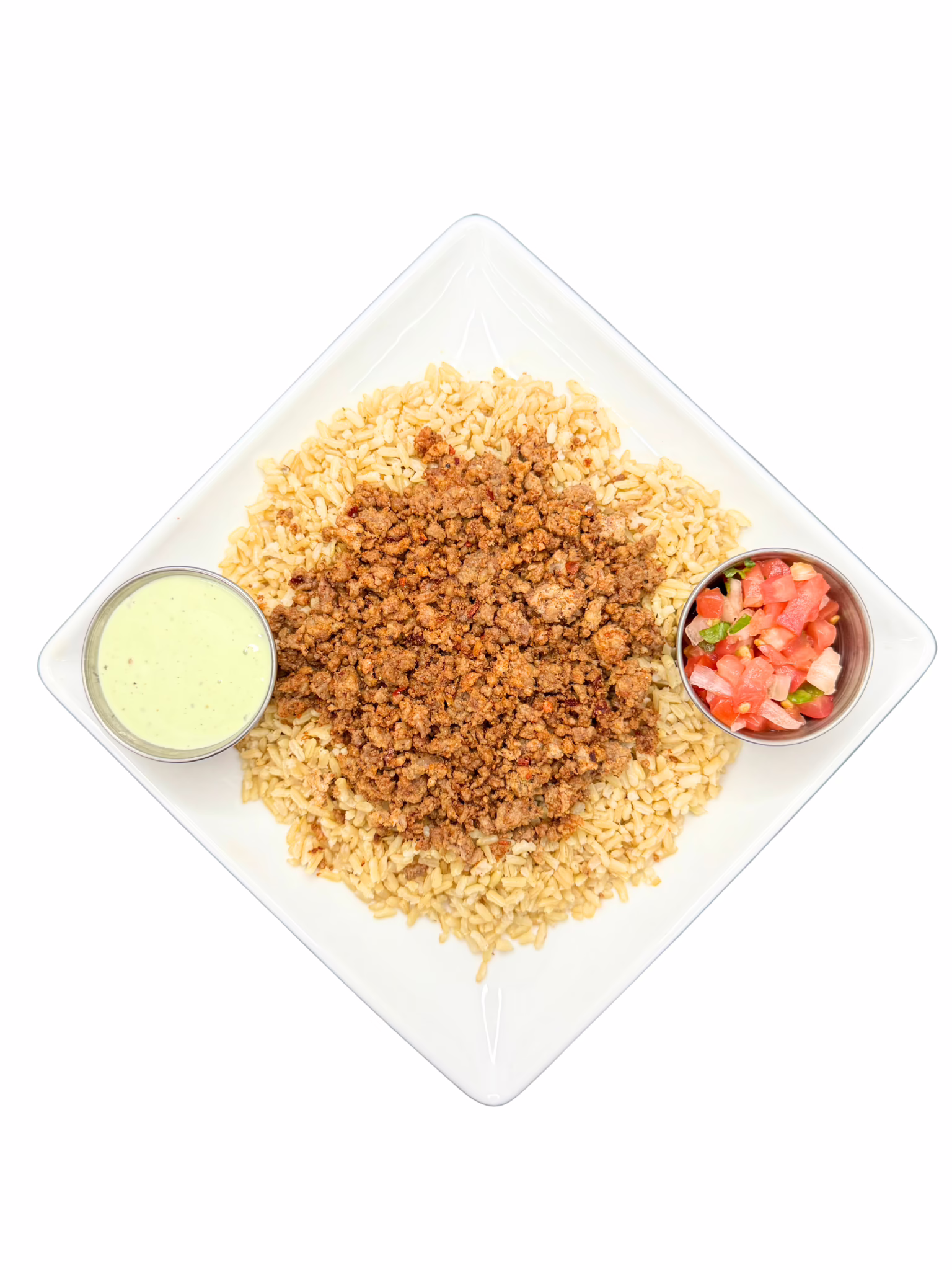 INGREDIENTS: ALL-NATURAL GROUND BEEF, BROWN RICE, BANG BANG SEASONINGS ( SAUCE ON THE SIDE: PICO, AVOCADO RANCH)