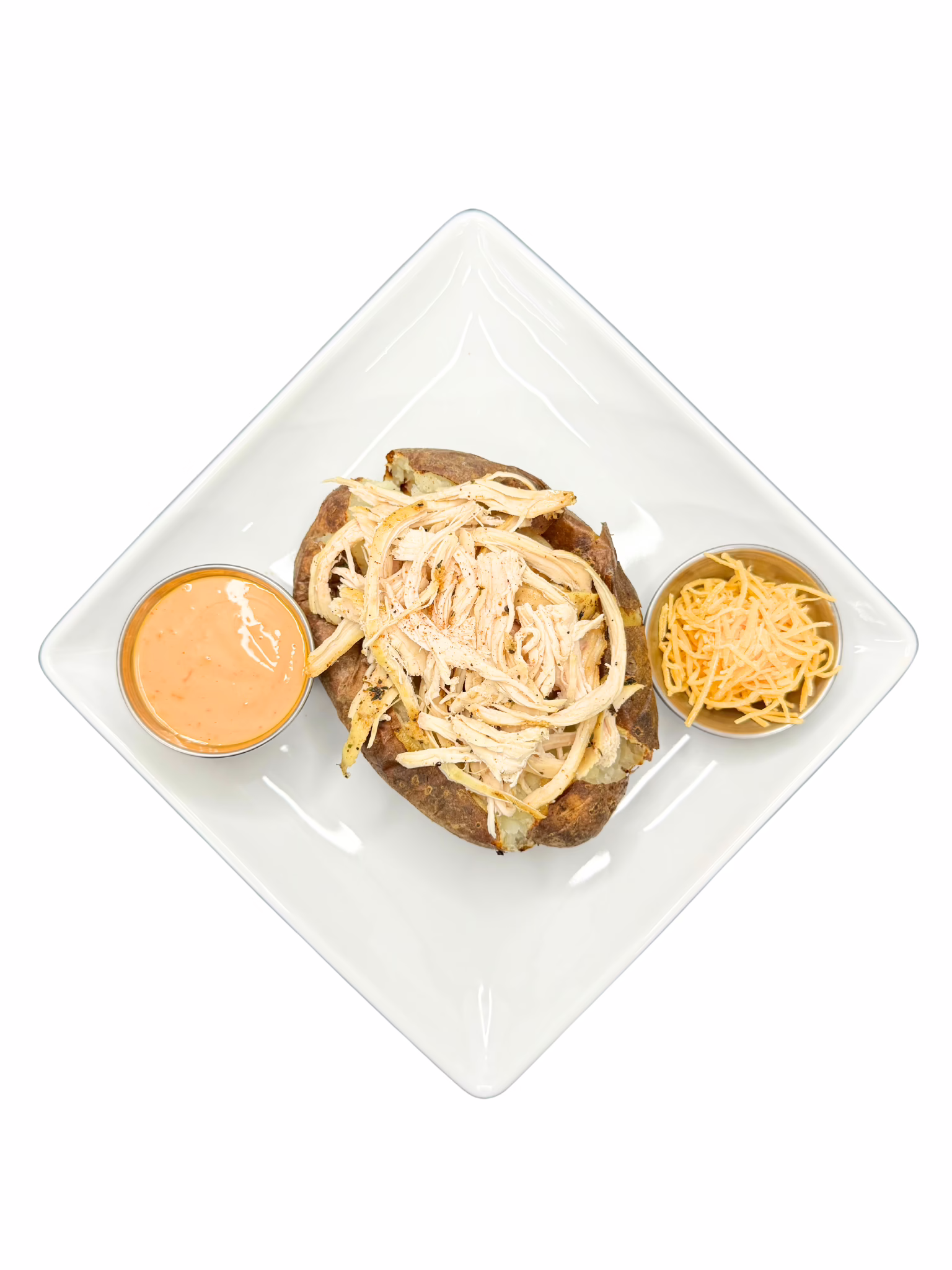 INGREDIENTS: WHITE POTATO, CHICKEN BREAST, SEASONINGS. (SAUCE ON SIDE: CHEDDAR CHEESE, BOOM BOOM)