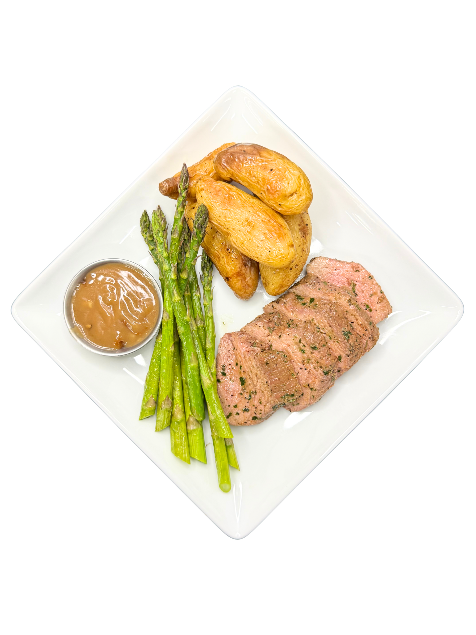 INGREDIENTS: FINGERLING POTATOES, TERES MAJOR, ASPARAGUS, OLIVE OIL, SEASONINGS. SIDE OF PEPPERCORN GRAVY