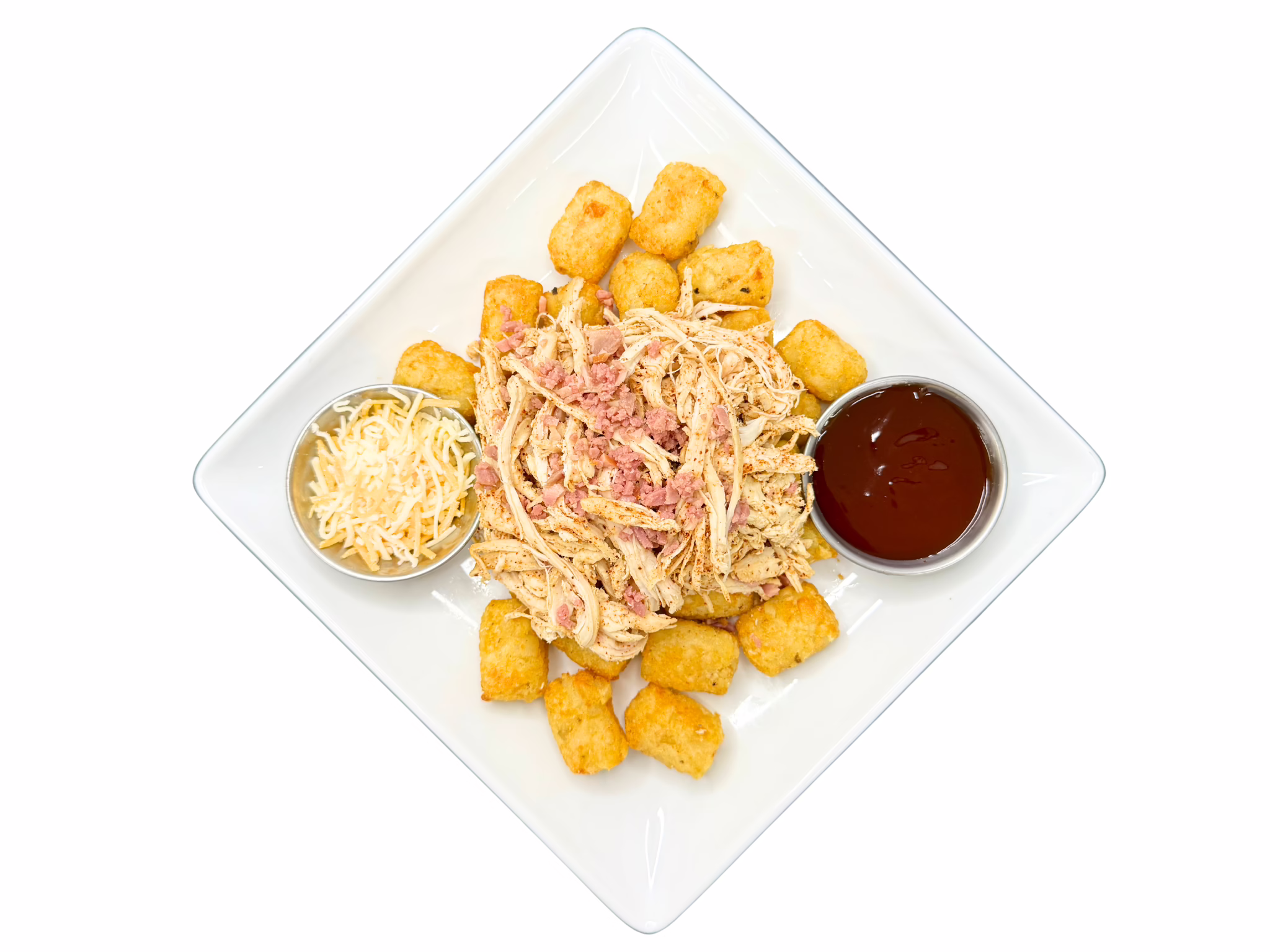 Tater tots topped with chipotle chicken and crispy turkey bacon, served with fiesta cheese and honey hot sauce on the side for the perfect sweet and spicy bite!