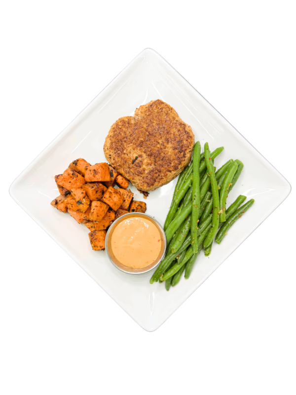 Our famous turkey burger with scratch made diced sweet potatoes and sautéed green beans served with boom boom sauce.