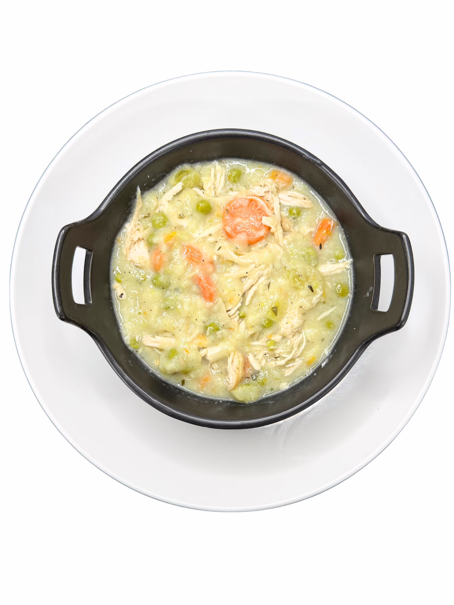 INGREDIENTS: WATER, DUMPLINGS, EGGS, CHICKEN, WHEAT FLOUR, PEAS, LIGHT CREAM, CARROTS, CELERY, ONIONS, BUTTER, SEASONINGS.